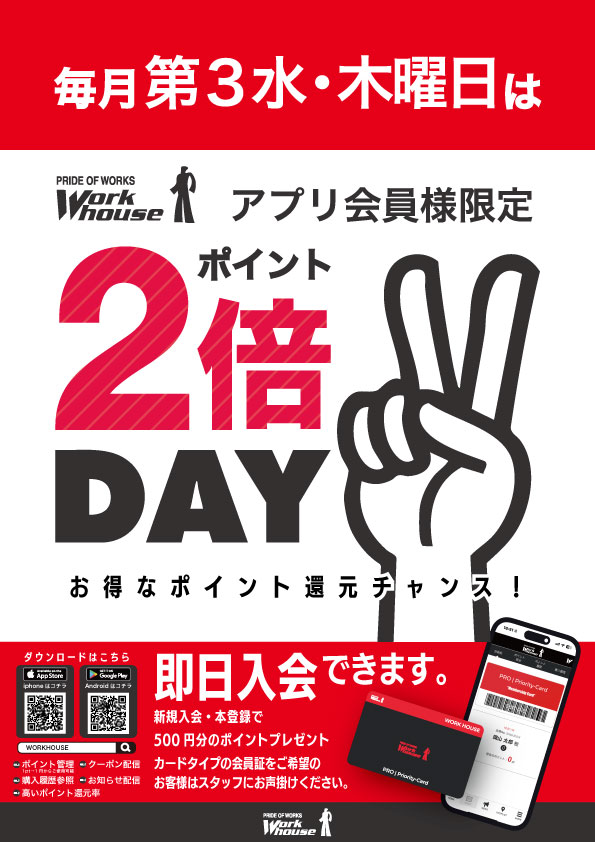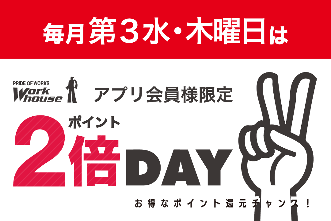 このたびワークハウスアプリ会員限定のお得な2倍ポイントキャンペーンが始まりましたのでお知らせいたします。